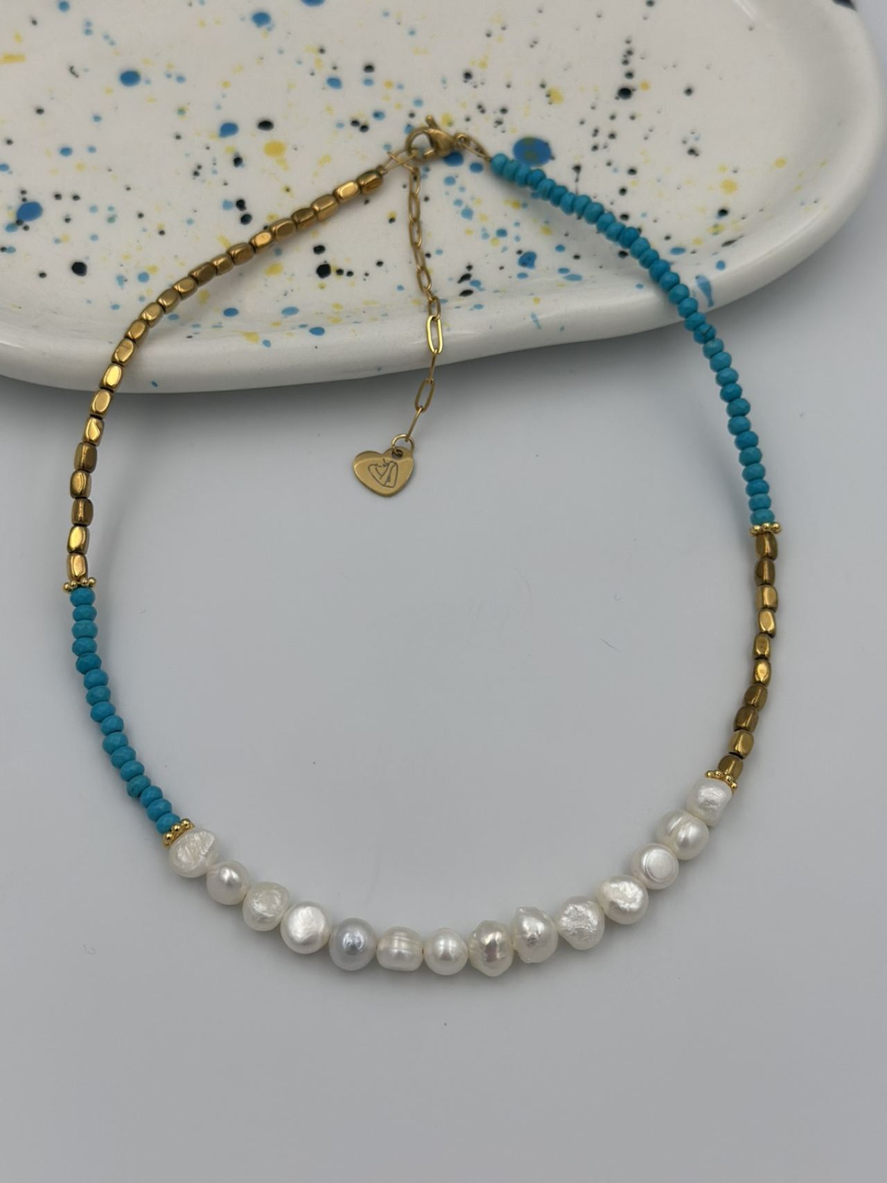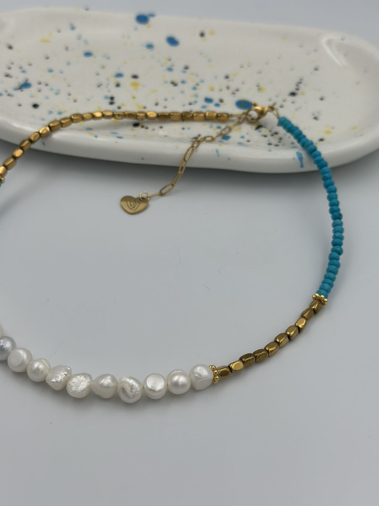 Με φυσικά μαργαριτάρια(γλυκού νερού), χρυσές πέτρες αιματίτη και πέτρες τιρκουάζ χαολίτη