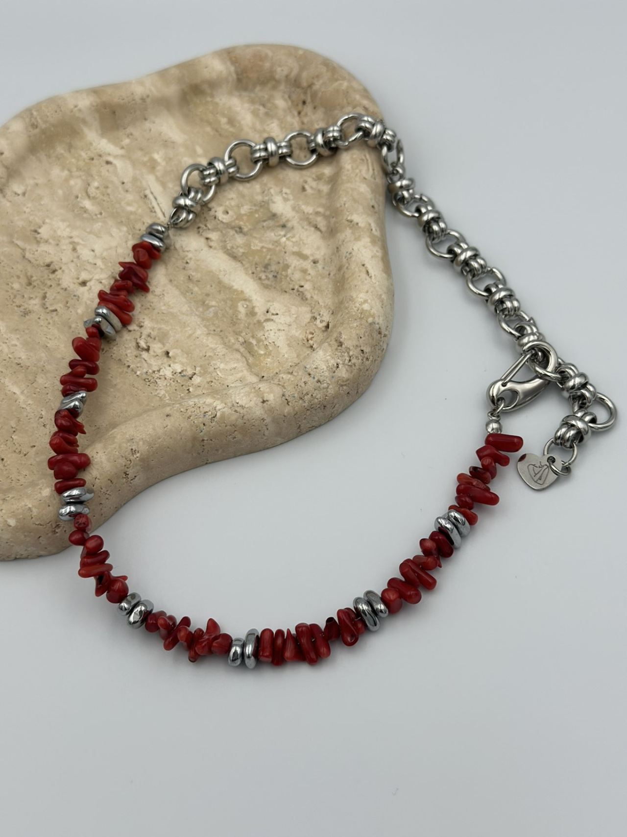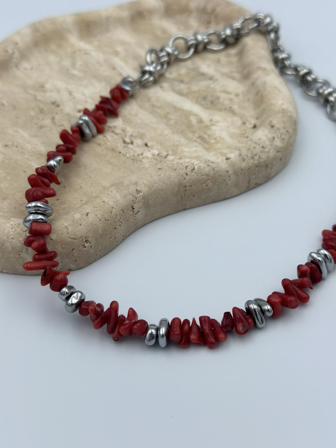 Με φυσικό κόκκινο κοράλλι, ασημί πέτρες αιματίτη και ατσάλινη αλυσίδα