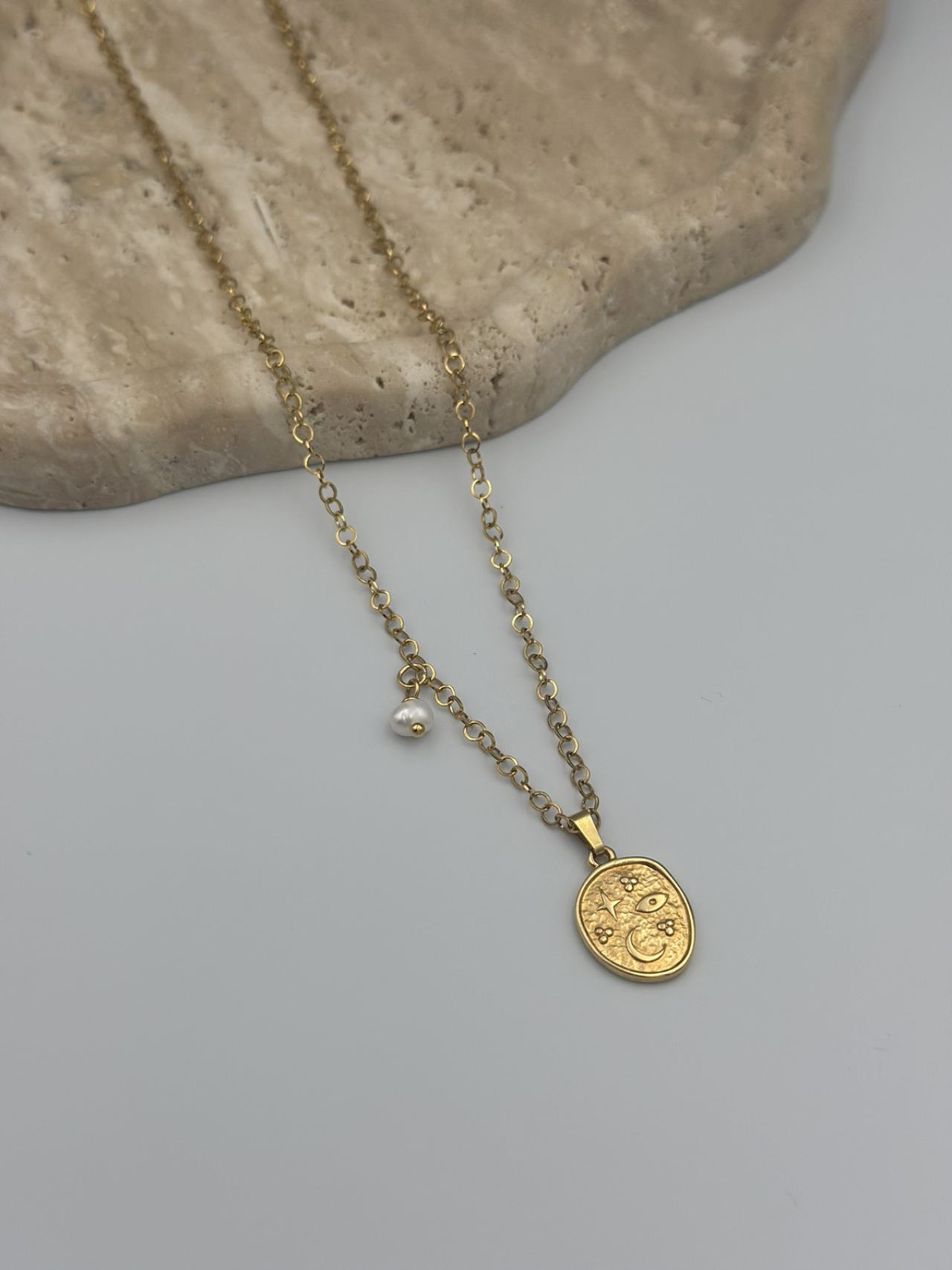 Φυσικό μαργαριτάρι(γλυκού νερού) και επιχρυσωμένο ορειχάλκινο στοιχείο περασμένα σε ατσάλινη αλυσίδα