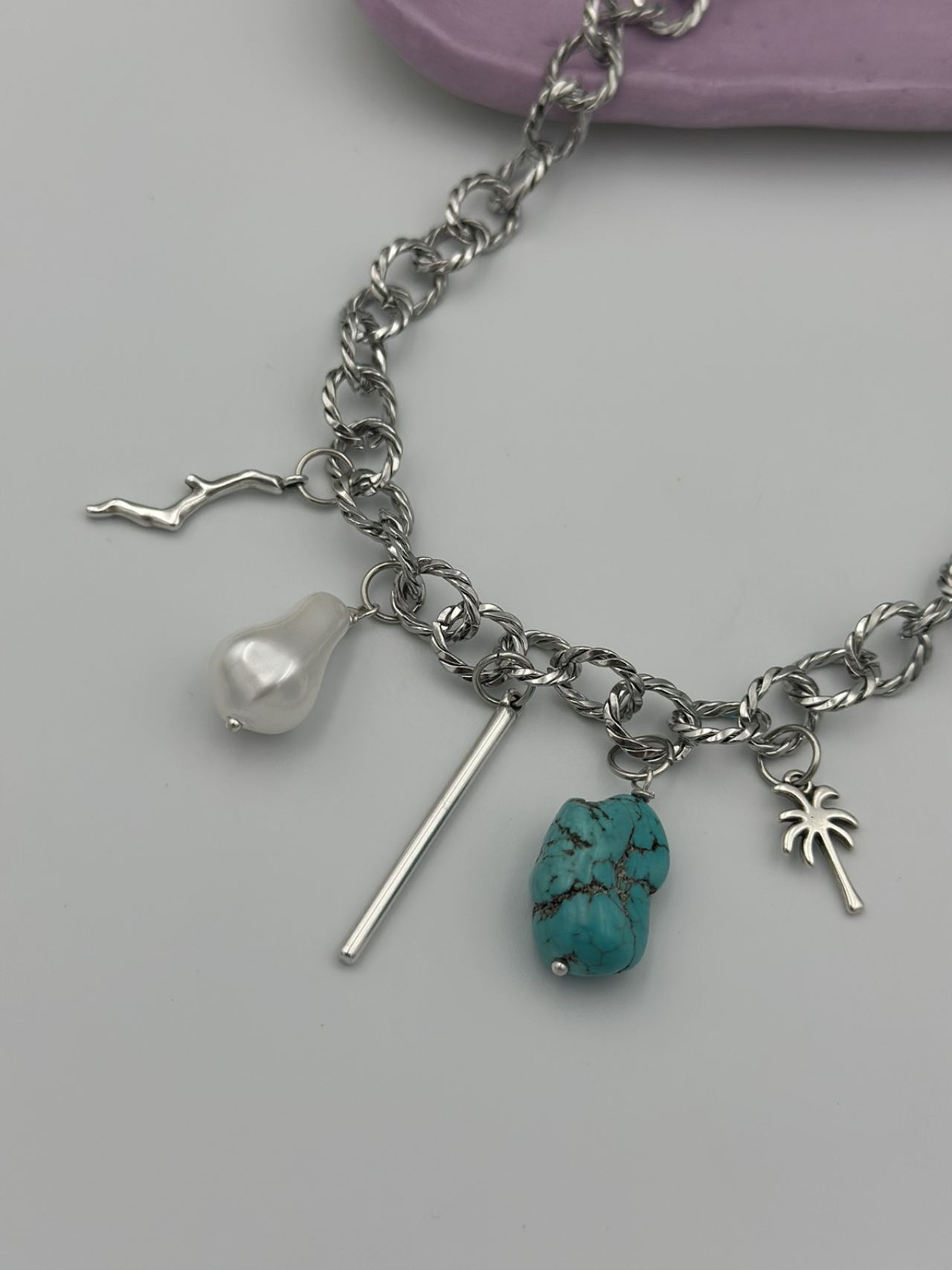 Μεγάλη πέτρα χαολίτη, συνθετικό μαργαριτάρι, επαργυρωμένα ορειχάλκινα στοιχεία, κρεμασμένα σε ατσάλινη αλυσίδα